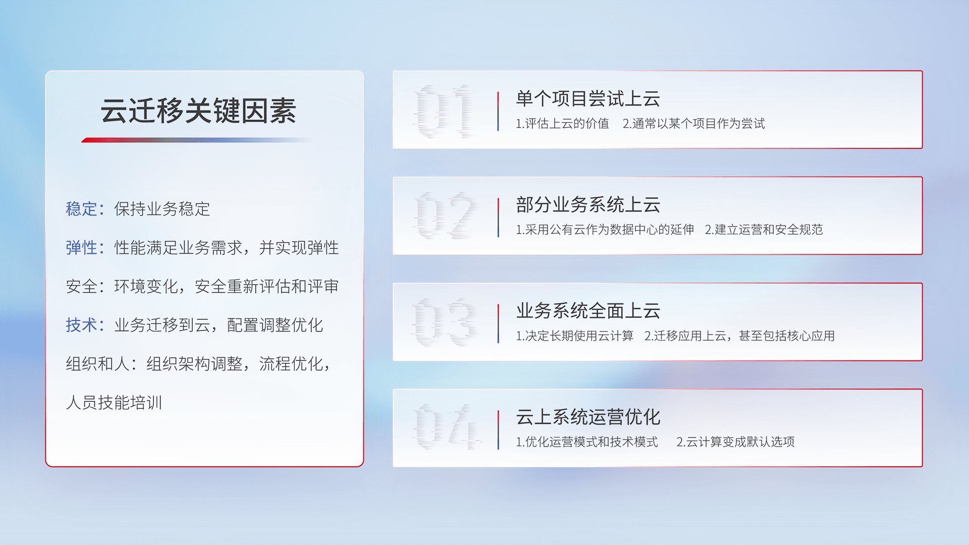 结合实际业务,,从规划设计、、、、云平台选型、、、、云原生改造、、数据迁移、、、集成交付,,,迁移全过程为客户识别最佳上云路径,,,做好风险识别管理,,,,设计网络架构、、、身份权限、、、、安全审计合规、、、操作审计、、、日志审计、、监控告警策略、、多站点容灾设计等,,,对云上基础设施进行整体规划,,,提升IT治理水平,,,,以满足弹性、、、高可用、、、、高性能的需求。。