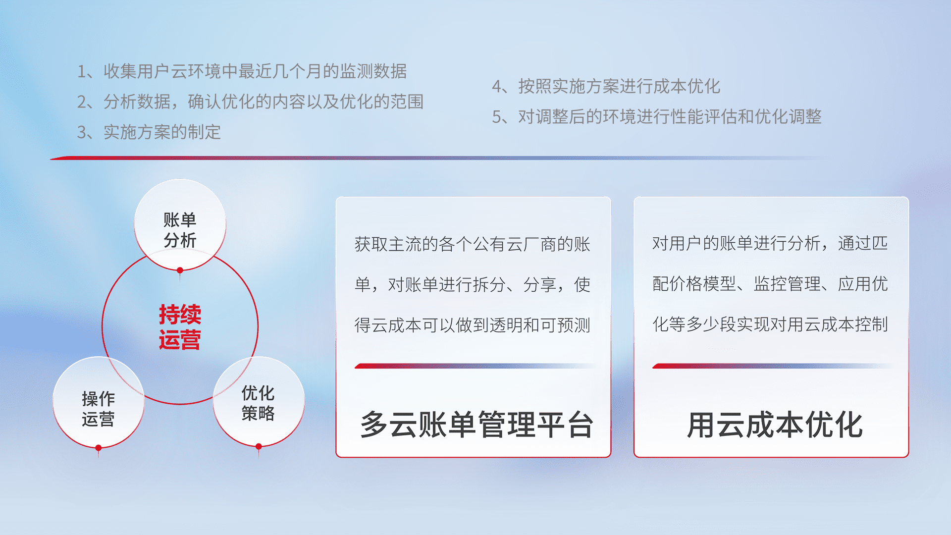 通过多云纳管,,,,以统一的资源数据模型把客户的云资源进行抽象和封装,,进而实现对多云资源的统一操作,,保障云资源管理的可靠性、、、、稳定性与可用性。。。量身定制化运维内容,,配置、、、开发运维、、、、补丁管理、、、备份、、、、监控、、认证和访问管理、、、审计和日常巡检等,,,,保障在用云过程中的可靠度,,,稳定度以及高可用率。。