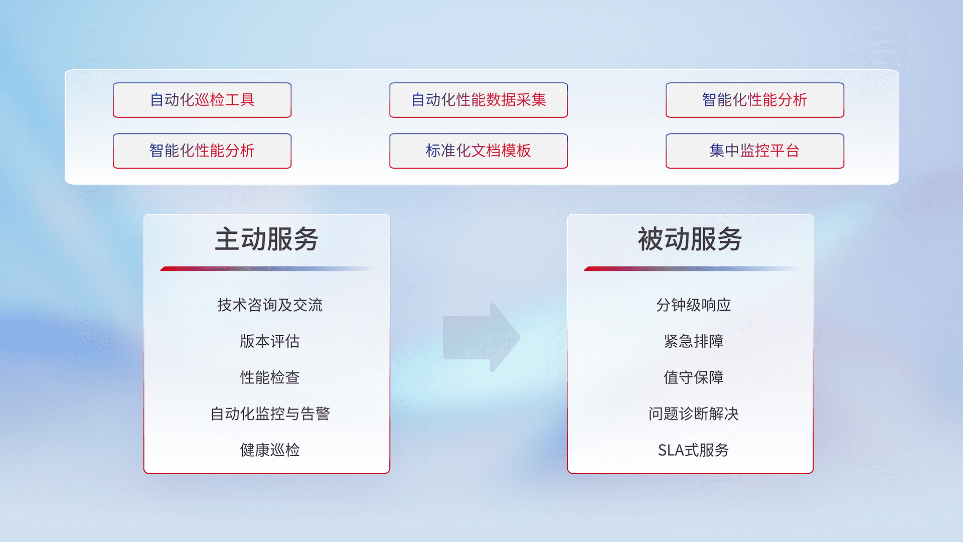 智能化工具和标准化文档,,保障服务质量,,,提供主动服务(包含技术咨询、、、、版本评估、、、、性能检查、、、、自动化监控与告警、、、、健康巡检)和被动服务包含(分钟级响应、、、、紧急排障、、值守保障、、、、问题诊断解决、、、SLA服务)。。